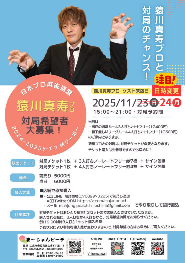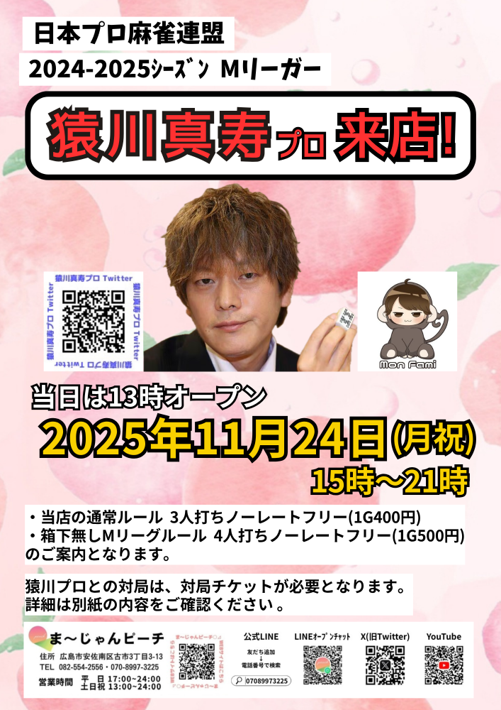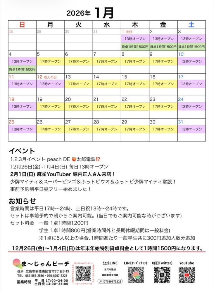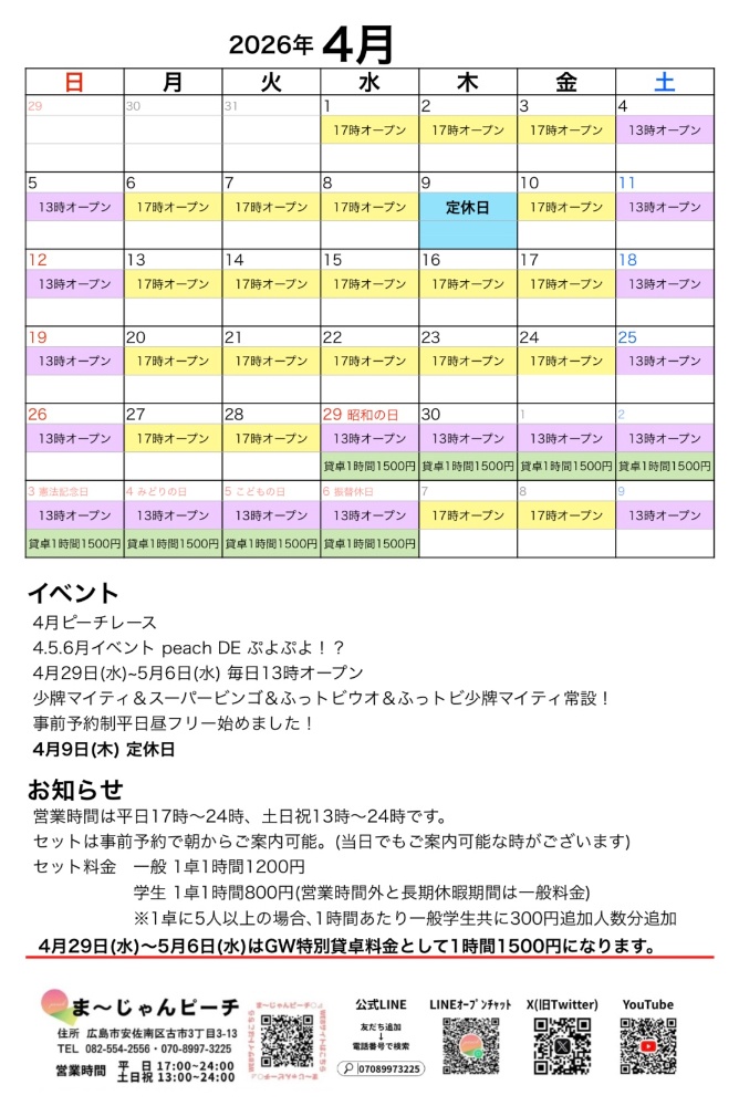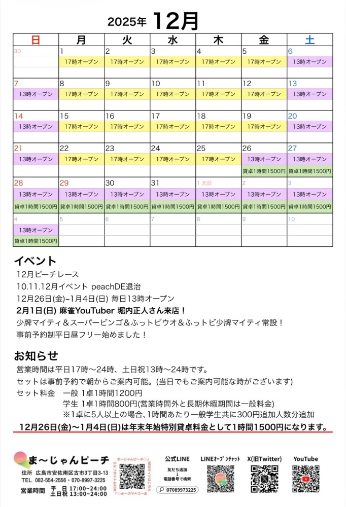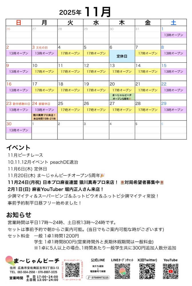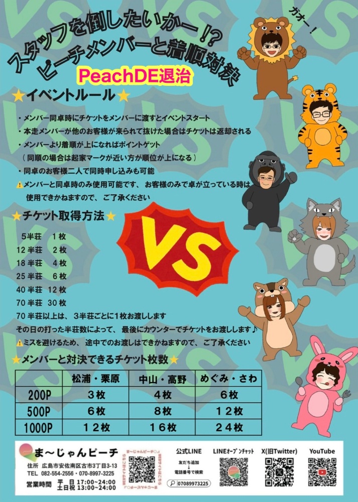 | 営業内容 | 【フリー】三麻のみ ・通常ルール ・少牌マイティ(暴風) ・スーパービンゴ ・ふっトビウオ ・ふっトビ少牌マイティ 【セット】 |