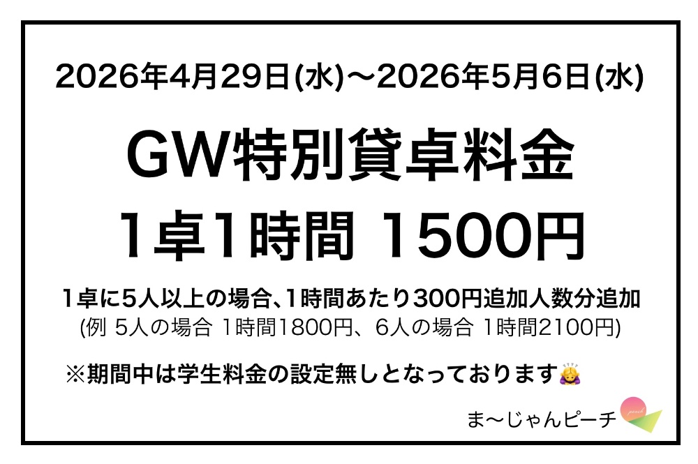 | 料金 | フリー 1G 400円~ セット 一般 1卓1時間1200円 セット 学生 1卓1時間800円(営業時間外と長期休暇期間は一般料金) ※セット1卓に5人以上の場合、1時間あたり一般学生共に300円追加人数分追加 (例 一般5人で利用1時間1500円、学生6人で利用1時間1400円) ※GW、お盆、年末年始は特別料金の設定あり |
